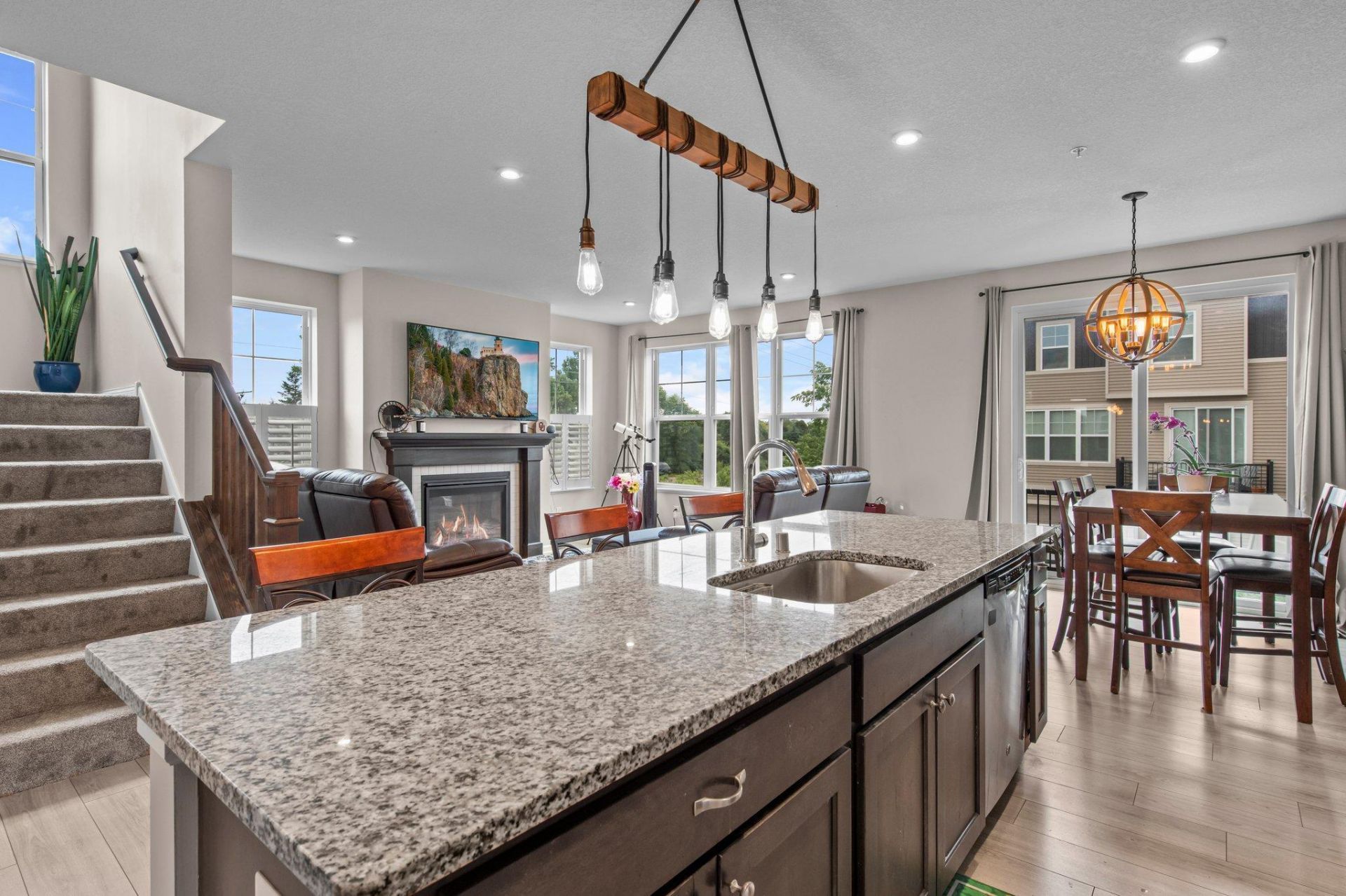 New Price! Come and See this amazing END UNIT which offers an inviting open-concept main floor, perfect for entertaining. Enjoy stunning west-facing sunsets from the comfort of your living space, featuring an 8-foot patio door + expansive windows w/custom window treatments&shutters. The flex room, currently utilized as an in-home office, provides versatile living options.The kitchen is a chef's delight, appointed w/granite countertops, stainless steel appliances- including a stand alone wine fridge, large island and a ceramic backsplash. The living room is loaded w/natural light and boasts a cozy gas fireplace in the living room. Upstairs, the large primary suite boasts a sumptuous private master bath with dual sinks, a spacious walk-in shower, and a generous walk-in closet along w/a large linen closet as well. Two additional bedrooms, a full bath, and a convenient second-floor laundry room complete the upper level. The finished lower level includes an inviting family room with daylight windows and ample additional storage space. With three complete levels, this home offers the feel of a single-family residence. Enjoy the convenience of being close to hwys 5 and 212 for easy commuting to the city or MSP Int'l AND being just a short distance from charming downtown Victoria, with its dining and entertainment options. Located on a one-way street with no through traffic, this home is also part of the highly-regarded District 112 schools. Close to parks, trails and more! You can't go wrong with this like new home- schedule a showing today!